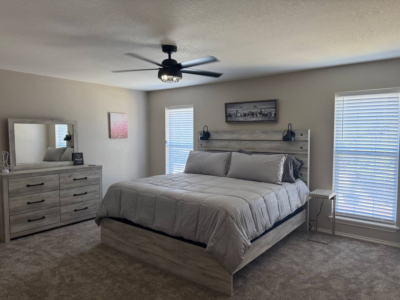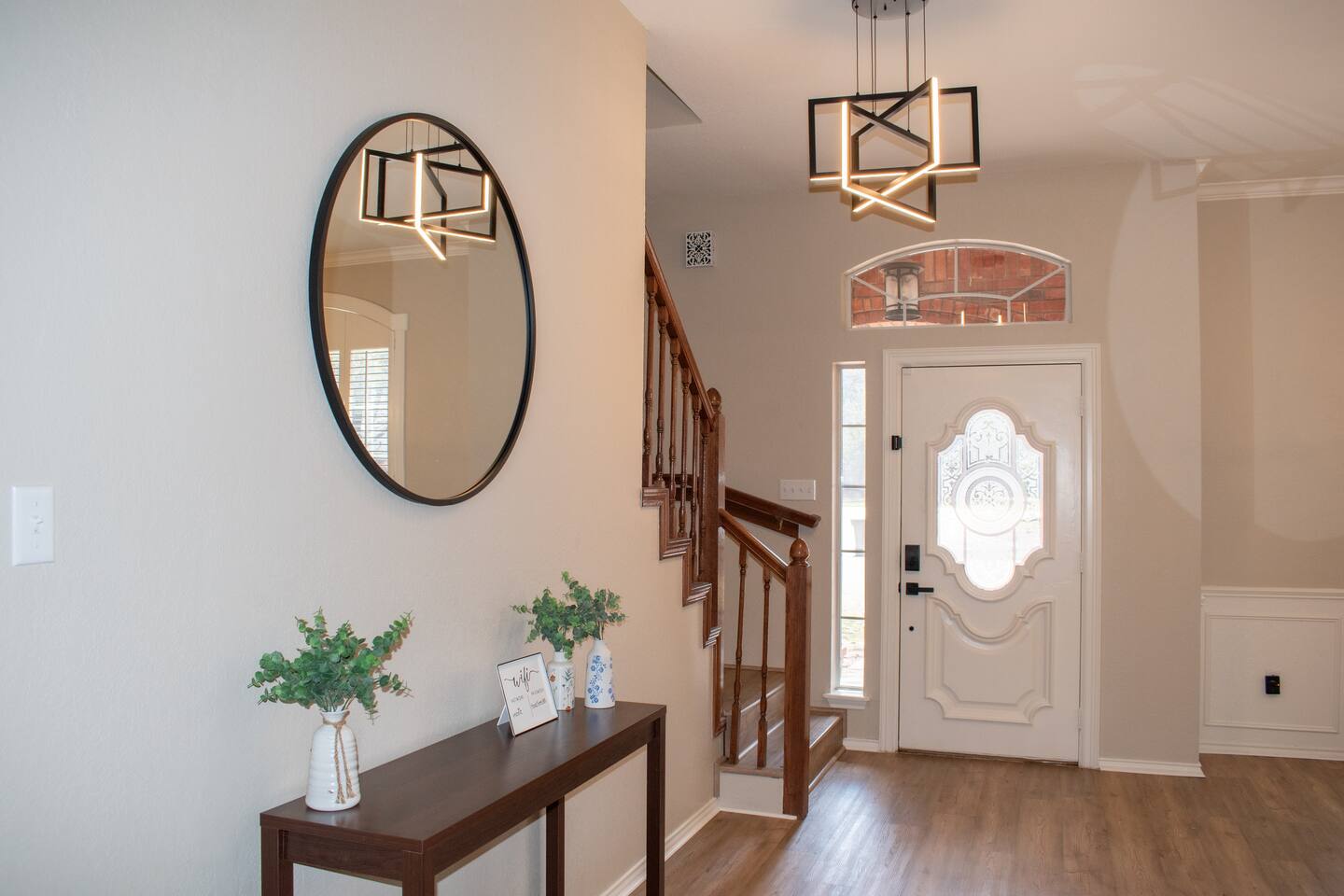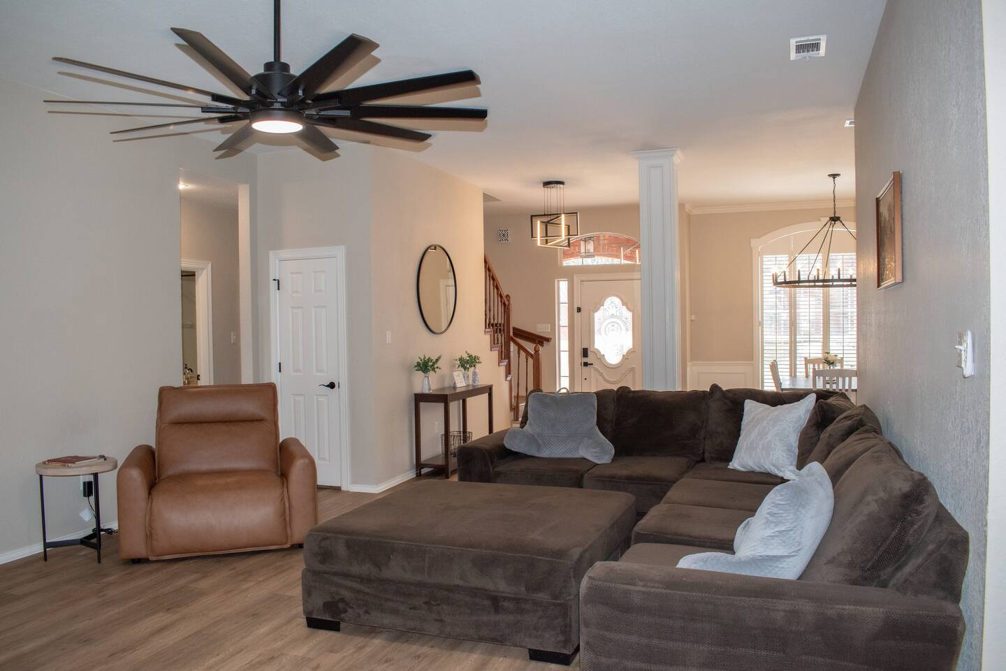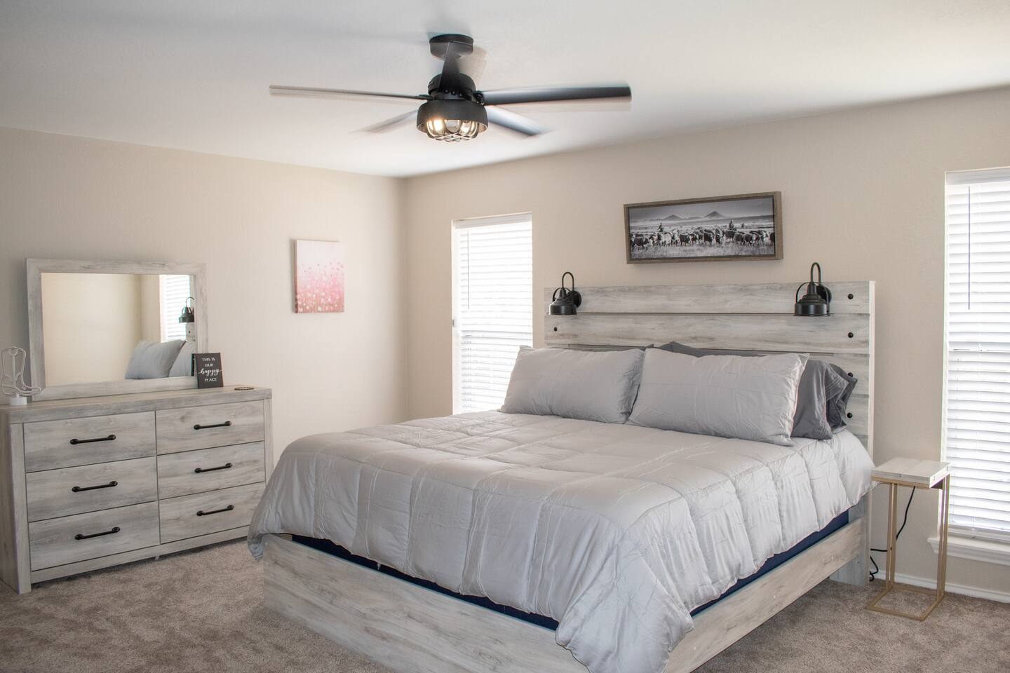 Smith’s Place is a beautiful two-story executive home in a quiet, upscale Central Abilene neighborhood near the highly sought-after Wylie Independent School District area. With 4 bedrooms and 3 baths, the layout offers excellent privacy: a downstairs king suite, an upstairs king suite with its own bath, and two queen bedrooms on the west wing sharing a bathroom. Ideal for business travelers, families, and groups who want space to spread out and relax.