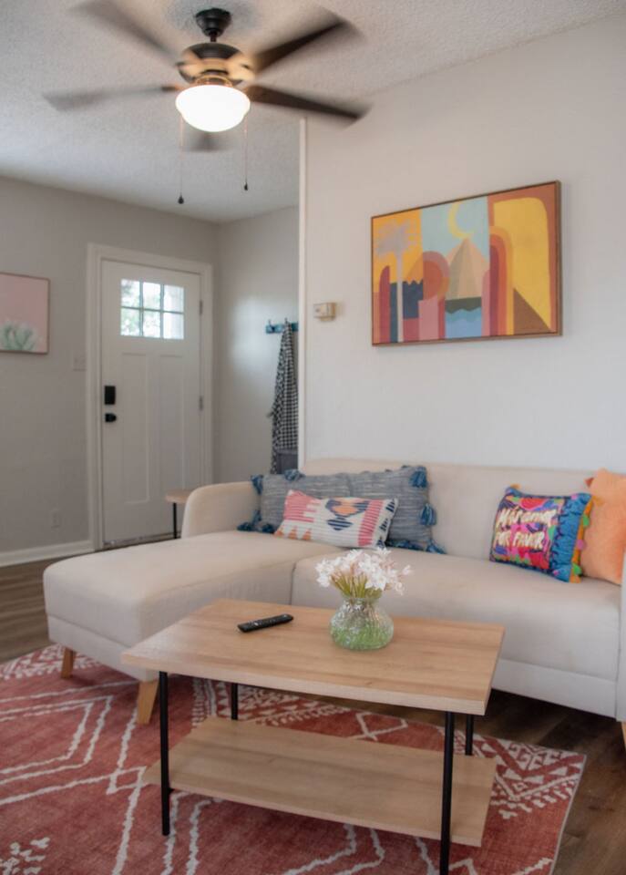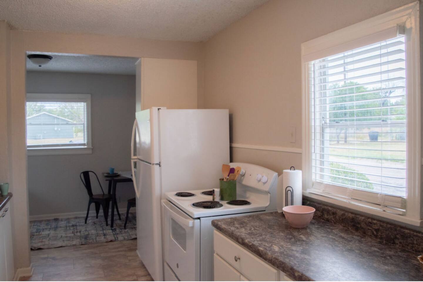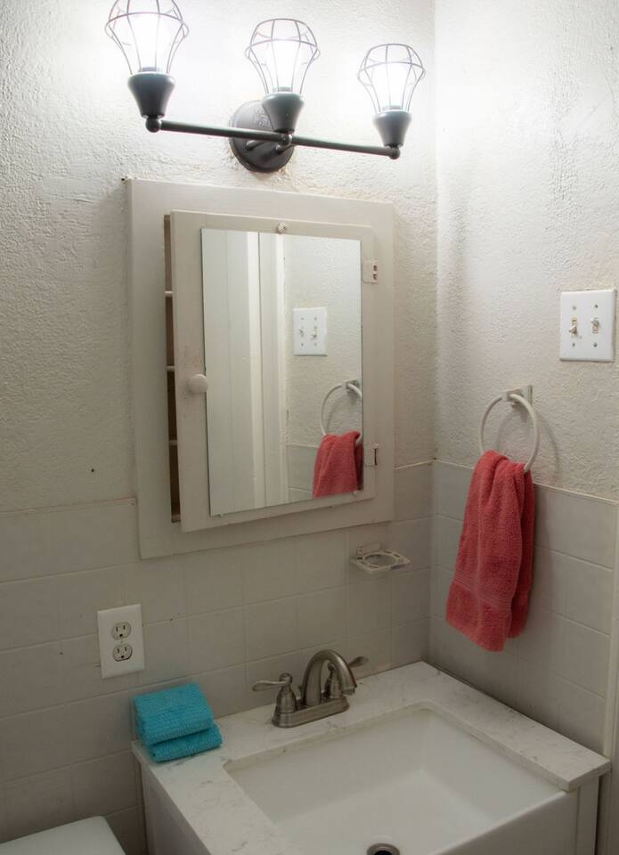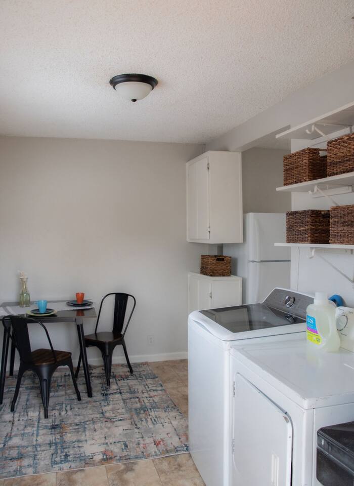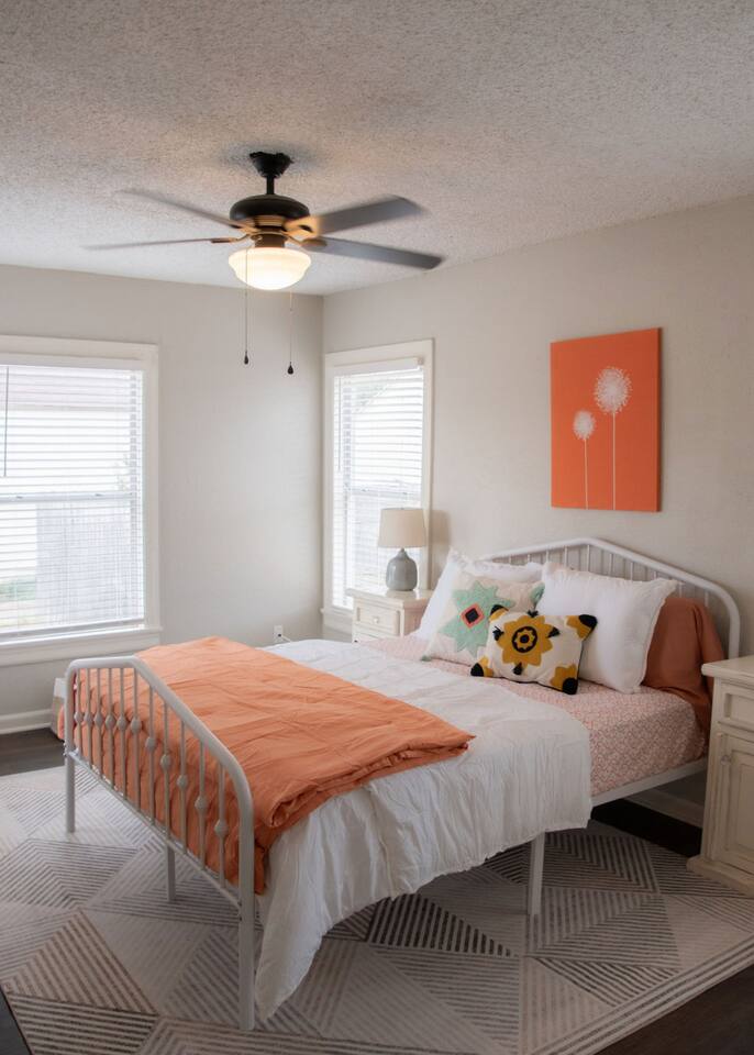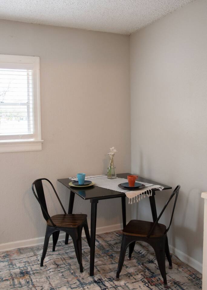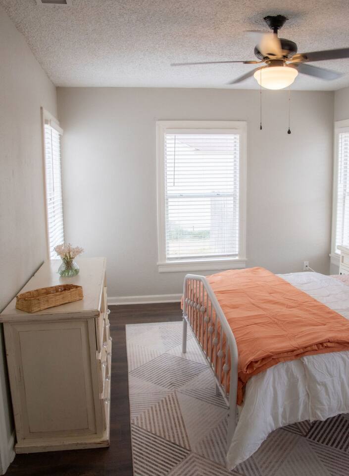Cozy 2-bedroom home in central Abilene with 2 queen beds, a small living room, dining nook, and a well-stocked kitchen. Washer and dryer included for your convenience. The bathroom is simple but clean with fresh towels. Nothing fancy here—just a humble, comfortable spot near HSU, ACU, Dyess AFB, and downtown. Perfect for an easy stay whether you’re visiting family, attending events, or just passing through. As with many older homes, it has a bit of character—including fewer outlets.